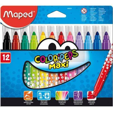 Flamastry COLOR'PEPS MAXI - 12 sztuk w kartonowym etui. Wentylowana skuwka.Tusz łatwo zmywalny ze skóry i tekstyliów. Mocna, gruba końcówka jest wytrzymała na nacisk. Intensywne kolory.