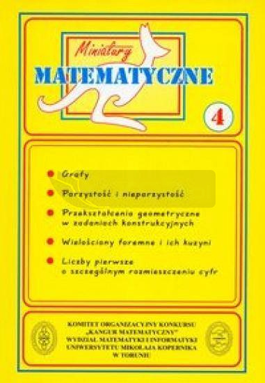 Organizowany od 1991 roku Międzynarodowy Konkurs ?Kangur Matematyczny zyskuje z roku na rok coraz większą popularność. Pragniemy podtrzymać tę dobrą atmosferę, dostarczając młodym uczniom zainteresowanym matematyką dodatkowego bodźca. Mamy nadzieję, że tę rolę spełnia seria książeczek ?Miniatury matematyczne, której czwarty tomik przekazujemy w Wasze ręce.GrafyParzystość i nieparzystośćPrzekształcenia geometryczne w zadaniach konstrukcyjnychWielościany foremne i ich kuzyniLiczby pierwsze o szczególnym rozmieszczeniu cyfr