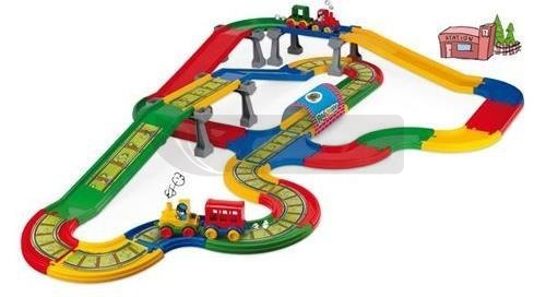 Miasteczko Kid Cars 6,3m - w skład zestawu o łącznej długości 6,3 m wchodzą 4 autka z serii Kid Cars, wiadukt nad torami kolejowymi oraz wiadukt nad autostradą, skrzyżowanie, zestaw naklejek. Jest to zestaw łączący kolejkę i autostradę Kid Cars. Jest to największy co do wielkości zestaw zabawek pochodzących z bardzo kolorowej serii Kid Cars. Wielkość wszystkich elementów oraz specjalnie wyprofilowane zaczepy sprawiają, że dziecko, w zależności od swojej wyobraźni, może samodzielnie tworzyć różnorodne kombinacje. Krótko mówiąc to 6,3 m wspaniałej zabawy. Zabawkę można łączyć z zestawami z serii Kid Cars 3D, Kid Cars, Kid Cars Sport oraz Friends on the Move.