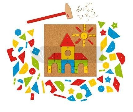 Zestaw do tworzenia kształtów z kolorowych figur. Za pomocą młotka należy przybijać je do korkowej planszy, a powstaną obrazki, jakie tylko podpowie wyobraźnia. Zestaw zawiera 118 elementów. Opakowanie zawiera: planszę korkową, różnokolorowe drewniane elementy z dziurkami, metalowe pinezki do przybijania, drewniany młotek oraz kartę z wzorami.