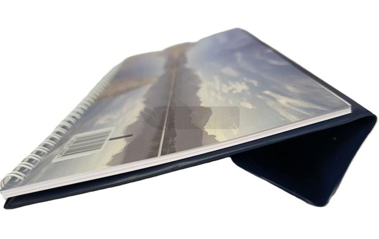 56 stron, jeden tydzień na jednej stronie, w dolnym rogu skrócony kalendarzyk trzech miesięcy, podstawa usztywniona PCV z możliwością położenia pod kątem, spirala w kolorze białym