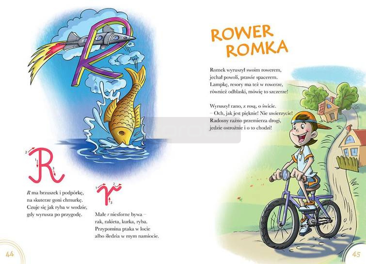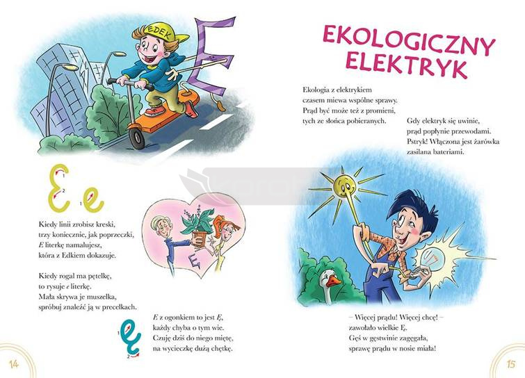 Wygląd każdej literki zost ał szczegółowo opisany wraz z radami, jak ją zapisać. Na stronie znajduje się również wzór litery ze strzałkami pokazującymi, jak prowadzić długopis. Ponadto do każdej literki dodany został jeszcze jeden wierszyk, opowiadający zabawną historyjkę związaną z konkretną literką. Abecadło... to doskonały wstęp do nauki czytania i pisania!