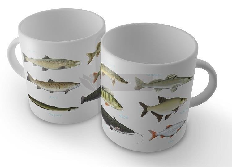 Na kubku znalazło się wiele wizerunków ryb. Praktyczna rzecz, a jakże cieszy oko miłośnika wędkowania!