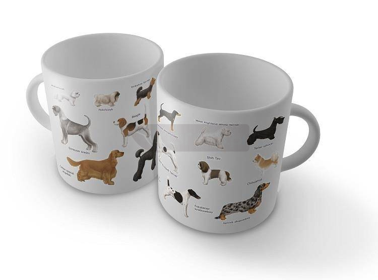 Kubek z wizerunkami psów o małej wielkości, m.in. Chihuahua, Yorkshire Terrier, Maltańczyk, Cocker spaniel i inne.