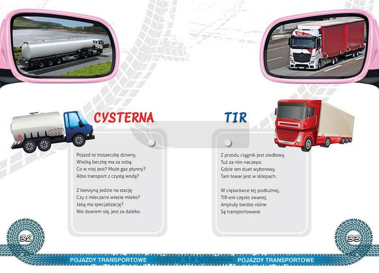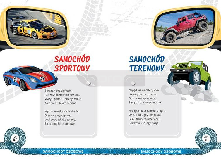 Każdy wierszyk wyjaśnia dokładnie, jakie jest zastosowanie danego pojazdu i gdzie go można zobaczyć. Każdy pojazd pokazany jest w dwojaki sposób. W lusterku samochodowym przedstawiono fotografię pojazdu, a poniżej rysunek. Taka forma ilustracji bardzo przypadła nam do gustu. Dziecko może zobaczyć pojazd tak jak wygląda w realu oraz jak przedstawiają go rysownicy.