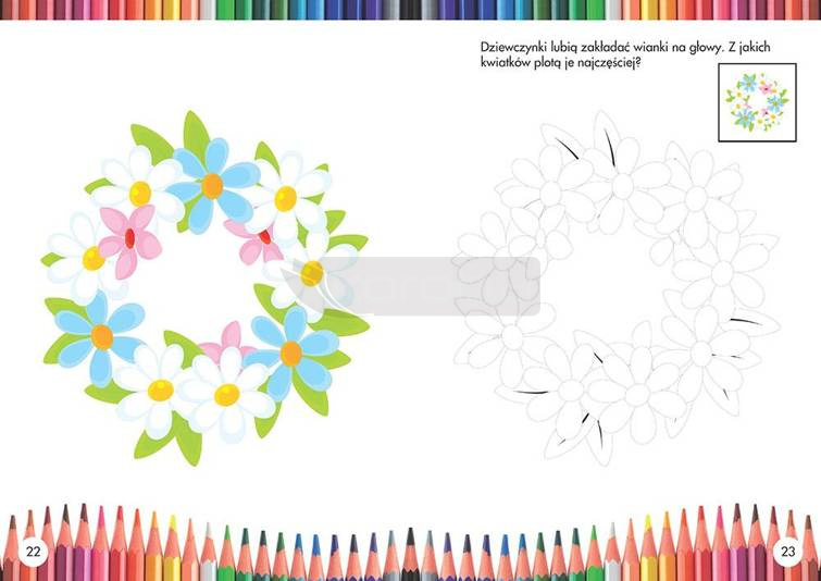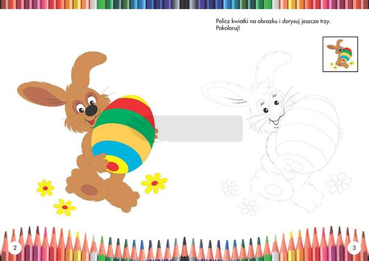 Znajdują się w niej wesołe, proste do kolorowania rysunki związane z wiosenną tematyką - są tu więc zwierzęta, rośliny, dzieci, ale także motywy Wielkanocne. Każdemu rysunkowi towarzyszy całostronicowy wzór pokazujący, jak go pokolorować, oraz jego miniaturka-naklejka, którą dziecko może przykleić na stronie.