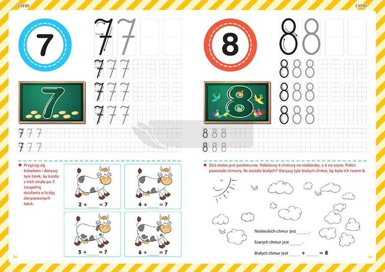 Książka wychodzi od prostych zadań na zbiorach, kształcących umiejętność rozróżniania stron (prawo lewo) oraz porównywania, wyodrębniania i łączenia całości, przez naukę kolejnych cyferek, aż do podstaw dodawania, odejmowania, mnożenia i dzielenia. Każda strona została zaopatrzona w dodatkowe informacje dla dorosłego, wyjaśniające, czego uczą zadania na niej i jak można pomóc maluchowi, by rozwiązanie zadań przyszło mu jeszcze łatwiej.