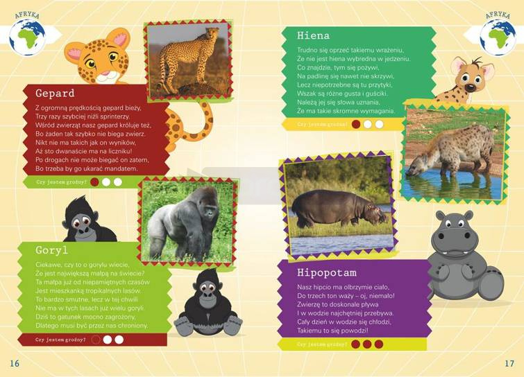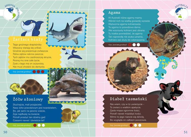Wierszyki mają walor edukacyjny - podają ciekawostki, fakty, interesujące informacje o zwierzętach, które są w nich prezentowane. Wielką atrakcją książki jest intuicyjnie prosta skala groźności, która pozwala dowiedzieć się, czy dane zwierzę jest dla człowieka niegroźne, groźne czy też zaliczamy je do zwierząt najbardziej niebezpiecznych.