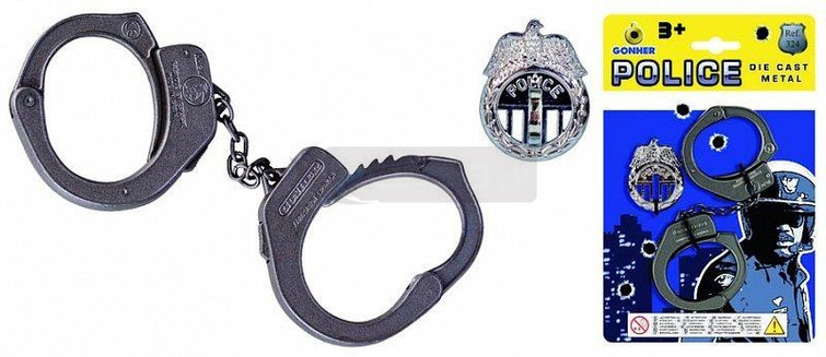 Zestaw zawiera metalowe kajdanki oraz plastikową odznakę policyjną.