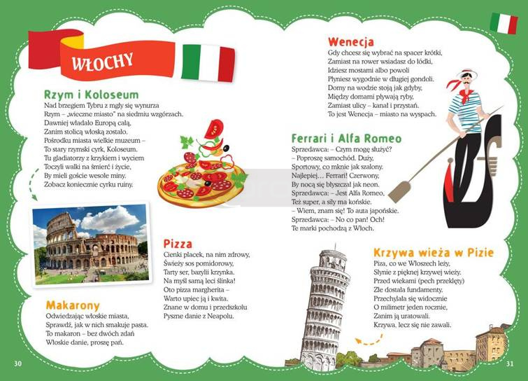 Poznaję świat to najlepsza książka dla wszystkich dzieci interesujących się innymi krajami, kulturami, uwielbiających podróże - choćby te palcem po mapie! Zawiera niezwykle ciekawe wierszyki, które opisują najciekawsze kraje świata, zabytki, obyczaje, mieszkańców.