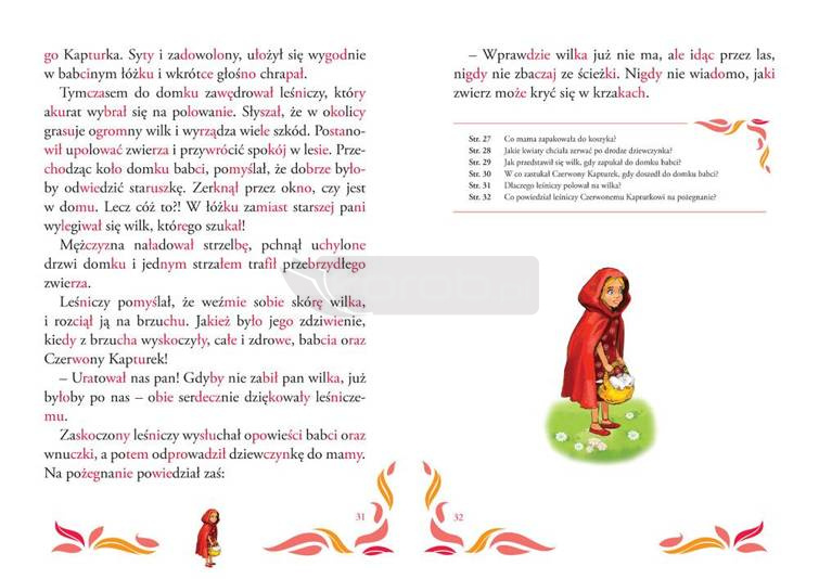 Dlatego Czytanki metodą sylabową zawierają teksty najbardziej znanych baśni, kochanych przez wszystkie dzieci, przygotowane metodą sylabową - z podziałem każdego wyrazu na sylaby zapisywane na przemian czarnym i czerwonym kolorem. Baśniom towarzyszą też pytania umożliwiające sprawdzenie, czy dziecko dobrze zrozumiało i zapamiętało - do każdej strony tekstu jedno pytanie.
