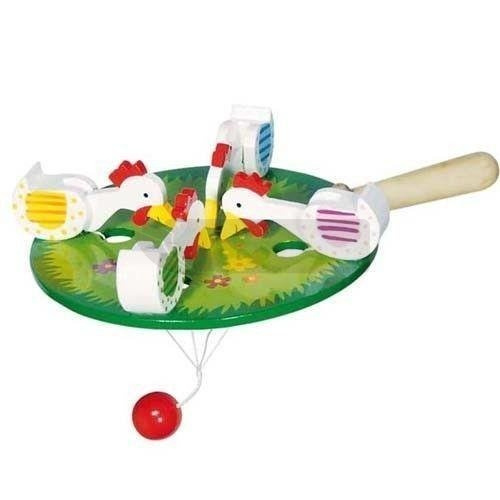 Gdy zwinnie rozbujasz kulkę zawieszoną pod paletką, kurki zaczną wesoło stukać dziobkami. Znakomite ćwiczenie na zręczność rąk dziecka!