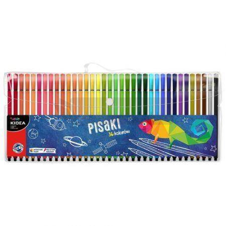 Zestaw 36 pisaków w wygodnym etui zapinanym na klips. Intensywne kolory gwarantują wykonanie efektownych prac. Cienka końcówka pozwala na precyzyjne rysowanie i kolorowanie. W zestawie znajduje się zabawna kolorowanka.
