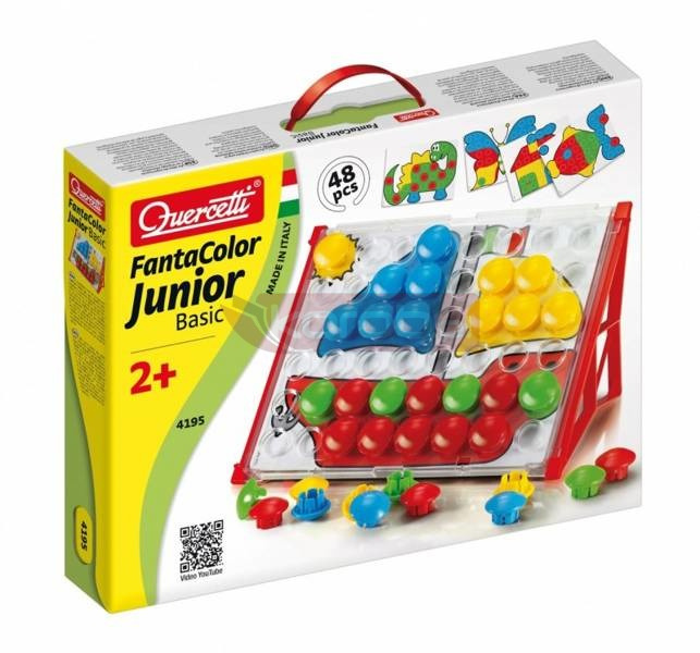 Quercetti Mozaika Fantacolor Junior Basic zestaw zawiera kolorowe kołeczki o średnicy 32mm, z których powstają piękne mozaiki.