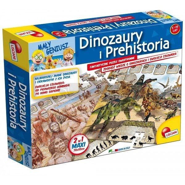 Na przodzie puzzli znajdują się dinozaury i wiele ciekawostek z ich życia. Z tyłu puzzli przedstawiono krok po kroku historię ewolucji człowieka: od pierwszej małpy, która zeszła z drzewa i przyjęła pozycję wyprostowaną po pojawienie się homo sapiens!
