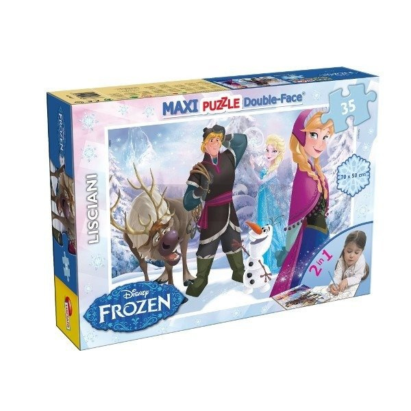 Puzzle Frozen maxi 35 elementów - dwustronneDwustronne puzzle firmy Lisciani umożliwiają ułożenie obrazka o rozmiarze 70 x 50cm, który widnieje na opakowaniu, a także pokolorowanie jego czarno-białego szablonu znajdującego się na odwrocie.