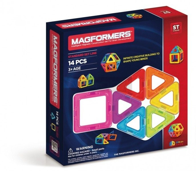 MAGFORMERS BASIC 14 to klocki z wbudowanymi silnymi magnesami neodymowymi, które zawsze się przyciągają. Wystarczy zbliżyć do siebie ściankami dwa klocki, a one natychmiast ze sobą się połączą. Za pomocą klocków wzorowanych na kształt figur geometrycznych można zbudować wspaniałe trójwymiarowe budowle. W zabawie można korzystać z dołączonej do zestawu instrukcji lub innych przykładów zamieszczonych na stronie magformersworld.com lub własnej wyobraźni.
