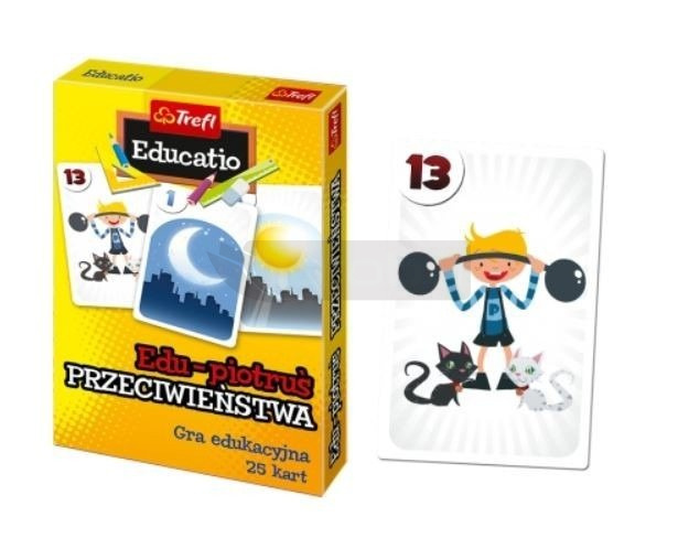 Przeciwieństwa to zestaw 12 par kart przedstawiających obrazki o przeciwnych znaczeniach. Zadaniem dziecka jest wskazanie jak największej liczby takich przeciwieństw. Dzień i noc, puste i pełne – to tylko niektóre z nich.