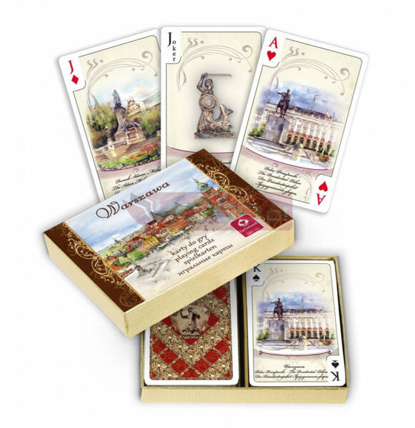 Komplet dwóch talii 55 listków zapakowane w eleganckie pudełko, doskonały pomysł na prezent, souvenir z Warszawy.