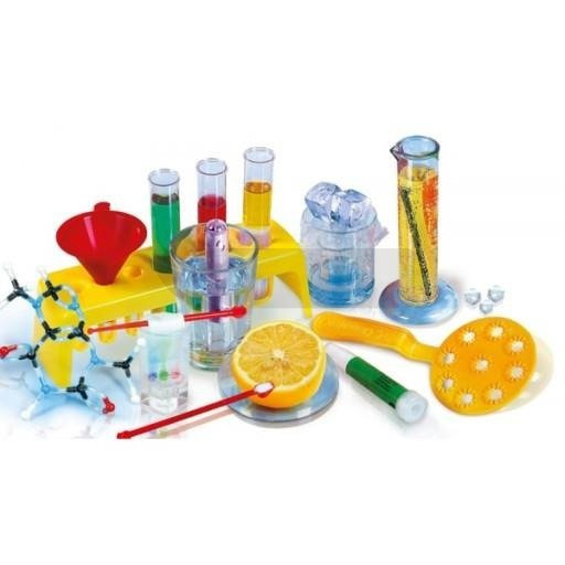 Kompletne laboratorium bogato wyposażone w profesjonalne przyrządy aby wykonać 150 łatwych i bezpiecznych doświadczeń. Dzięki prostej i wyczerpującej, ilustrowanej instrukcji możliwe jest wykonanie zabawnych doświadczeń z użyciem bezpiecznych substancji chemicznych powszechnego użytku. Zestaw zawiera: okulary ochronne zlewki z pokrywkami probówki z korkami szczotkę do mycia pojemników mieszadełko pipetę balony zabezpieczenie probówek menzurkę lejek stojak do probówek szpatułki papier do filtrowania pincetę różdżkę do baniek mydlanych substancje chemiczne: (kwas winowy, węglan sodu, uniwersalny papierek wskaźnikowy) ilustrowaną instrukcję.