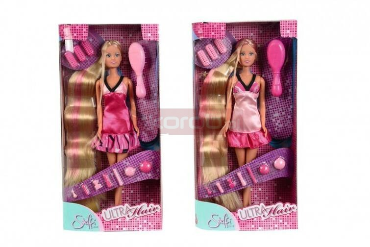 Steffi z bardzo długimi włosami, w błyszczącej sukience. W zestawie znajdują się akcesoria do stylizacji włosów.