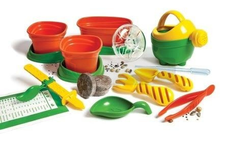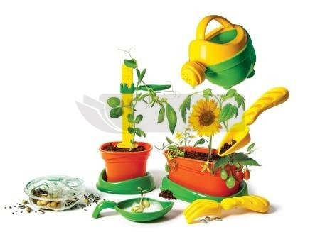 Zawiera bogaty zestaw komponentów i sprzętu dla małego ogrodnika: doniczki, grabie, łopatę, pincety, a nawet gleby i nasiona.