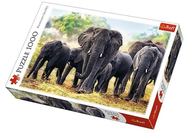 Puzzle 1000 elementów przedstawiające słonie afrykańskie. Po ułożeniu powstanie obrazek o wymiarach 68x48 cm. Wysoką jakość, nasycenie kolorów i bezpieczeństwo układania zapewnia kalandrowany papier odbijający światło, pokryty ekologicznymi farbami spożywczymi.