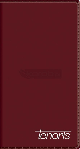 format 102 x 193 mm układ tydzień na 2 stronach całkowita objętość 144 strony w tym część informacyjna 16 stron papier offset 80g/m2 druk 2 kolory skorowidz tele-adresowy luźna wkładka zeszytowa okładka folia PVC