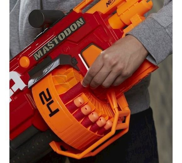 Nerf Nstrike mega mastodon B8086 to jedna z największych i najpotężniejszych wyrzutni Nerf jakie kiedykolwiek wyprodukowano. Nazwa nawiązująca do prehistorycznego olbrzyma jest więc bardzo trafiona bo ten potwór waży niemależe 4 kg. By łatwiej było posługiwać się tą wyrzutnią, Hasbro wyposażyło ją w górną rączkę do trzymania oraz regulowany pas do przewiesznia przez ramię. Mastodon to wyrzutnia w pełni automatyczna wystarczy więc przytrzymać spust by wystrzelić cały 24-strzałkowy magazynek. Strzałki mega świszcząc w locie wręcz zsypują przeciwnika! Wspaniałe uczucie i mega frajda! Jeżeli chodzi o zasilanie to czerwone działo zasilane jest na 6 baterii typu D z zasięgiem do 23 metrów. Zasięg został już potwierdzony przez Youtuberów, a ponadto dzięki nowemu systemowi napędzania strzałek osiągają one zaskakującą celność na średnich dystansach. Dlaczego Nerf Mastodon: prawdopodobnie najpotężniejsza seryjna wyrzutnia jaką stworzono pierwsza w pełni automatyczna wyrzutnia z serii Mega świetna celność i zasięg pas do noszenia wyrzutni Zawartość zestawu: Wyrzutnia Nerf Mega Mastodon 24 strzałki typu N-strike Mega pas do noszenia wyrzutni. Zabawka przeznaczona jest zgodnie z zaleceniami producenta dla dzieci powyżej lat 8.