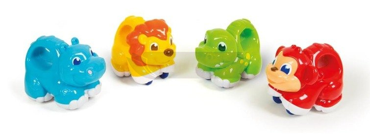 Poznajcie lwa, hipopotama, małpkę i krokodyla, cztery sympatyczne zwierzątka z sawanny.