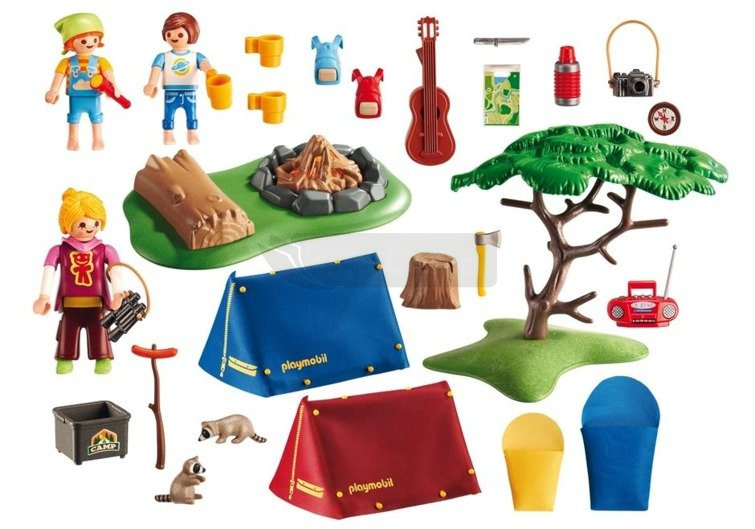 Zestaw Playmobil "Pole namiotowe z ogniskiem led" przedstawia typowe obozowisko namiotowe. Centralnym punktem zestawu są dwa namioty z akcesoriami oraz ognisko, przed którym znajduje się pień drzewa służący za siedzisko. Do funkcjonowania ogniska potrzebne są dwie baterie 1,5-V-AAA (nie są dołączane do zestawu). Otoczenie dopełniane jest przez roślinność oraz zwierzęta.