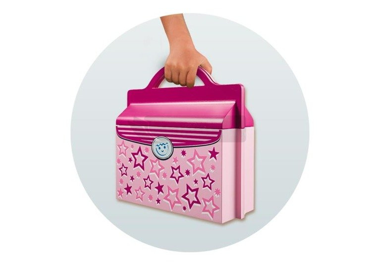 Butik w kształcie rozkładanej, eleganckiej walizeczki zamienia się w zakupowy raj. Znajdziesz w nim półki do ekspozycji kolekcji, eleganckie lustro do mierzenia kreacji, ladę z kasą i witryną na drobne akcesoria, a także parawan, za pomocą którego stworzysz intymną strefą dla klientek. Wymiary otwartego butiku: 41x4x20 cm. W zestawie: 2 figurki Playmobil do przebierania walizeczka, która po rozłożeniu zamienia się w elegancki butik lada z witryną na ekspozycję drobnych akcesoriów parawan lustro 3 sukienki 3 spódniczki 4 torebki wieszak manekin peruka, włosy do doczepienia