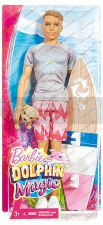 Zanurkuj w oceanie wspaniałej zabawy z Kenem z filmu "Barbie, Delfiny z Magicznej Wyspy". Towarzyszący mu przesłodki szczeniaczek i modna deska surfingowa urozmaicą tropikalną przygodę! Ken - ubrany w szary T-shirt z nadrukiem "OCEAN WAVE", różowe szorty ze wzorkiem i białe tenisówki - już nie może doczekać się szaleństwa wśróc fal. Jego supermodna deska surfingowa w stylu retro ozdobiona jest kolorowymi paskami, osobnym panelem imitującym naturalne drewno, a także motywem delfina. Doczep stopy lalki do klipsów na desce i wypłyńcie razem na podbój morskich fal. Nie zapomnij zabrać ze sobą szczeniaczka! Szykuje się niezła zabawa! Wielbicielki wakacyjnych przygód pokochają odgrywać ulubione scenki i opowiadać własne historyjki zrówno nad, jak i pod poziomem morza, bo z Barbie mozesz być kim chcesz.