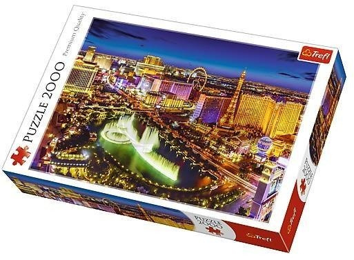 Puzzle 2000 elementów z nocną panaromą Las Vegas. Po ułożeniu powstanie obrazek o wymiarach 96x68 cm. Wysoką jakość, nasycenie kolorów i bezpieczeństwo układania zapewnia kalandrowany papier odbijający światło, pokryty ekologicznymi farbami spożywczymi.