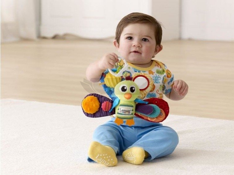 Na ogonie pawia znajdują się: piszczałka, grzechotka, bezpieczne lusterko,warstwowe skrzydełko z 3 piórkami do przekładania. Piękne kolory i wzory, ciekawa faktura materiału, szeleszczące elementy zachęcą Twoje dziecko do zabawy, pobudzając jego zmysł dotyku, słuchu i wzroku. Wygodny uchwyt umieszczony w zabawce pozwoli na zabranie jej wszędzie ze sobą i umieszczenie w dowolnie wybranym przez nas miejscu: wózek, łóżeczko, nosidełko-fotelik samochodowy, jak również zamiennie do maty edukacyjnej.