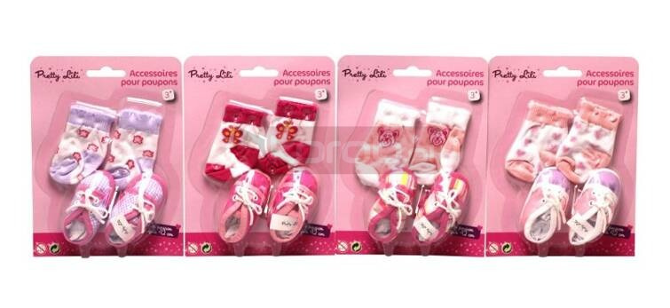 W zestawie 1 para bucików i 1 para skarpetek, przeznaczone dla lalek 38-43 cm.