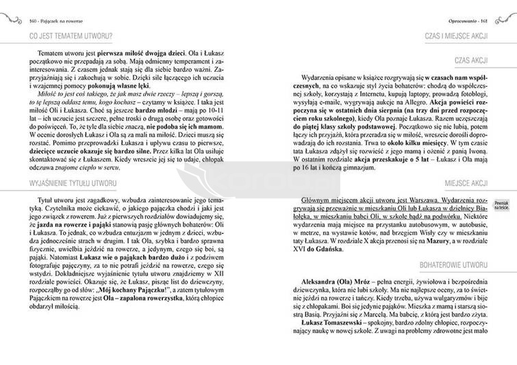 Wydanie Pajączka na rowerze kompletne bez skrótów i cięć w treści. W tym wydaniu znajdziesz odpowiedzi na pytania z podręcznika - pewniak na teście, czyli wskazanie zagadnień, które zwykle pojawiają się w pytaniach z danej lektury we wszelkich testach sprawdzających wiedzę, a także w podręcznikach i na klasówkach. Zawiera bardzo szczegółowe streszczenie oraz drugie skrócone, ułatwiające szybkie przygotowanie się przed lekcją. Opracowanie zawiera plan wydarzeń, wnikliwie wyjaśnioną problematykę oraz szerokie charakterystyki bohaterów.
