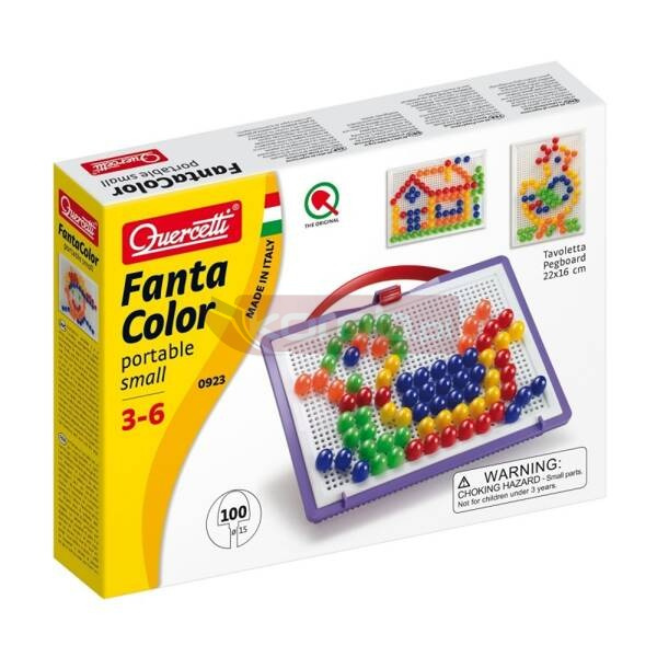 Zestaw składa się ze 100 kołeczków, kartonowych kart – wzorów oraz walizeczki z rączką, która po rozłożeniu staje się podstawką i tabliczką o wymiarach 22 x 16cm.