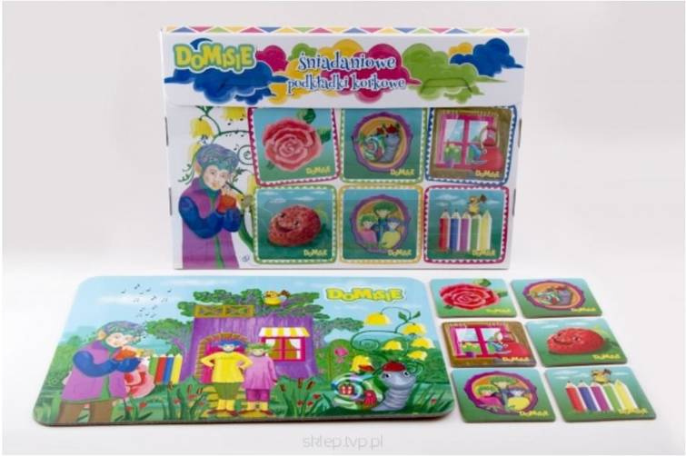 Domisie zapraszają do swojej krainy. Zestaw korkowych podkładek z Domisiowa to kolorowy początek dnia dla Twojego dziecka. Domisiowe podkładki sprawią, że nawet największy niejadek zje ze smakiem śniadanko i obiadek. Zestaw zawiera: - 6 małych podkładek po kubek 0,93 x 0,3 cm - 1 dużą podkładkę pod talerz 42 x 30 cm