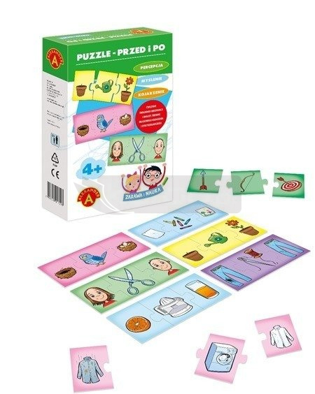 Zabawa polega na przyczynowo –skutkowym ułożeniu puzzli. W każdym zestawie znajdują się 3 obrazki prezentujące sytuację pierwotną, czynnik zmieniający oraz wynik tej zmiany.