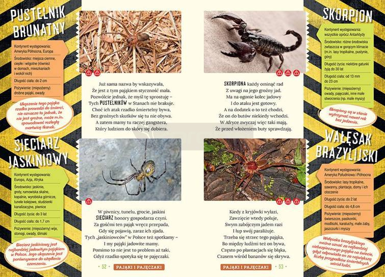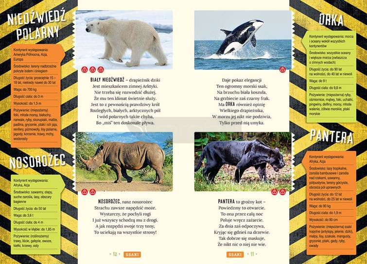 Każde zwierzę opisane jest krótkim wierszykiem, któremu towarzyszy ukazujące je zdjęcie oraz notka podająca najważniejsze dane na jego temat - gdzie żyje, ile waży, jak długo żyje, czym się żywi. Wielką atrakcją jest skala groźności - pokazująca, jak bardzo niebezpieczne dla człowieka jest dane zwierzę.