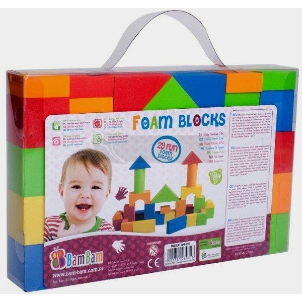 BAM BAM Klocki piankowe 29 elementów, bezpieczne dla małych dzieci, żywa kolorystyka, wydaje dźwięki, od 18 miesiąca życia, Dla dzieci powyżej 18 miesiąca życia. Składają się z 29 elementów. Kolorowe klocki o różnych kształtach i kolorach. Piankowe klocki to gwarancja kreatywnej i bezpiecznej zabawy dla każdego dziecka.