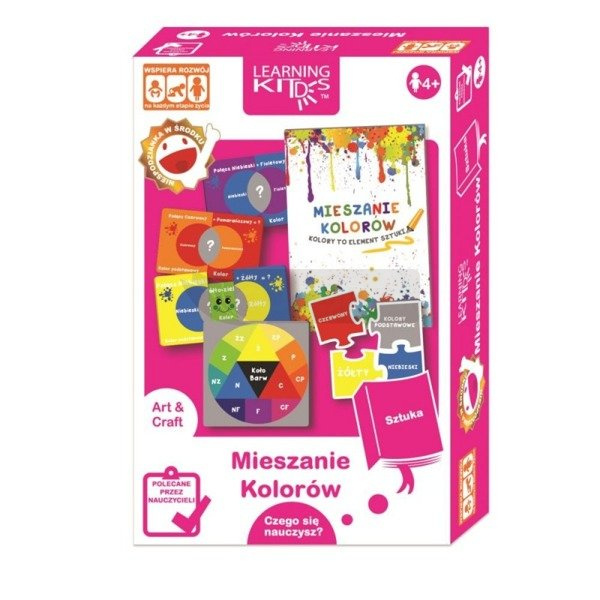 LEARNING KITDS - Mieszanie Kolorów Kolory to element sztuki. Poznaj teorię kolorów, na podstawie koła barw . Dowiedz się czym są kolory podstawowe, drugorzędne i trzeciorzędne. Kieruj się kołem barw, aby nauczyć się jak mieszać kolory zanim zaczniesz zabawę z kartami i puzzlami. Ostrzeżenie: Nieodpowiednie dla dzieci w wieku poniżej 3 lat.