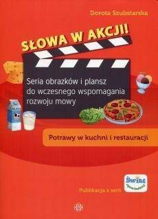 Małe dziecko nie uczy się słów. Nabywa mowę razem z wiedzą o świecie. Dlatego, aby bogacić słownikowy inwentarz, trzeba nasycić dziecko językiem zaangażowanym, czyli uczestniczącym w działaniu. Słowa w akcji to pomoc o prawie nieograniczonych możliwościach. To narzędzie, które pozwala ożywić język i nadać mu funkcje użytkowe. Połączenie obrazków, przedstawiających potrawy i ich składniki, z uproszczonymi planszami, prezentującymi między innymi kuchenkę z garnkiem i patelnię, misę z mikserem czy stoliki w restauracji, umożliwia wprowadzenie akcji, na przykład przygotowywanie dań czy zamawianie potraw. Zatem dziecko nie tylko uczy się prostego nazywania, ale bawiąc się, poznaje kolejne słowa w kontekście sytuacyjnym i gramatycznym zarazem. Publikacja stanowi twórczy sposób na wspomaganie rozwoju mowy małego dziecka.