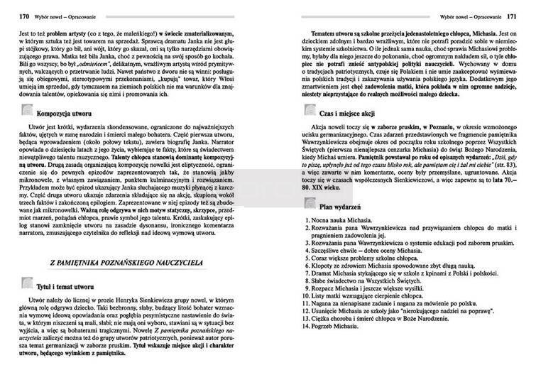 Wydanie Wyboru nowel Henryka Sienkiewicza kompletne bez skrótów i cięć w treści. W tym wydaniu znajdziesz odpowiedzi na pytania z podręcznika - pewniak na teście, czyli wskazanie zagadnień, które zwykle pojawiają się w pytaniach z danej lektury we wszelkich testach sprawdzających wiedzę, a także w podręcznikach i na klasówkach. Zawiera bardzo szczegółowe streszczenie oraz drugie skrócone, ułatwiające szybkie przygotowanie się przed lekcją. Opracowanie zawiera plan wydarzeń, wnikliwie wyjaśnioną problematykę oraz szerokie charakterystyki bohaterów. .