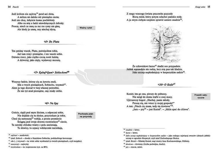 Wydanie Fraszek, Pieśni, Trenów kompletne bez skrótów i cięć w treści. W tym wydaniu znajdziesz odpowiedzi na pytania z podręcznika - pewniak na teście, czyli wskazanie zagadnień, które zwykle pojawiają się w pytaniach z danej lektury we wszelkich testach sprawdzających wiedzę, a także w podręcznikach i na klasówkach. Zawiera bardzo szczegółowe streszczenie oraz drugie skrócone, ułatwiające szybkie przygotowanie się przed lekcją. Opracowanie zawiera plan wydarzeń, wnikliwie wyjaśnioną problematykę oraz szerokie charakterystyki bohaterów.