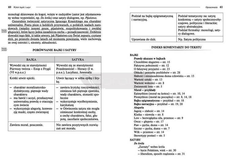 Wydanie Wyboru bajek i satyr kompletne bez skrótów i cięć w treści. W tym wydaniu znajdziesz odpowiedzi na pytania z podręcznika - pewniak na teście, czyli wskazanie zagadnień, które zwykle pojawiają się w pytaniach z danej lektury we wszelkich testach sprawdzających wiedzę, a także w podręcznikach i na klasówkach. Zawiera bardzo szczegółowe streszczenie oraz drugie skrócone, ułatwiające szybkie przygotowanie się przed lekcją. Opracowanie zawiera plan wydarzeń, wnikliwie wyjaśnioną problematykę oraz szerokie charakterystyki bohaterów.
