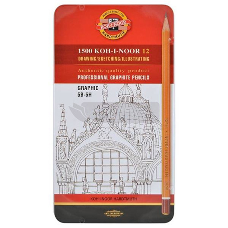 Zestaw artystycznych ołówków Koh-I-Noor 1502. Ołówki grafitowe Koh-I-Noor od dziesiecioleci cieszą się światową reputacją jako synonim jakości. Seria 1500 produkowana jest w 20 stopniowej wyjątkowo precyzyjnej skali gradacji, wyróżniają się wysoką transparentnością i łatwym usówaniem. Oprawki cedrowe tych sześciobocznych ołówków są wielokrotnie lakierowane. Zestaw artystyczny zawiera 12 ołówków średniej gradacji w metalowej kasecie od 5B do 5H polecane głównie grafikom do szkicowania, cieniowania oraz rysowania konturów.
