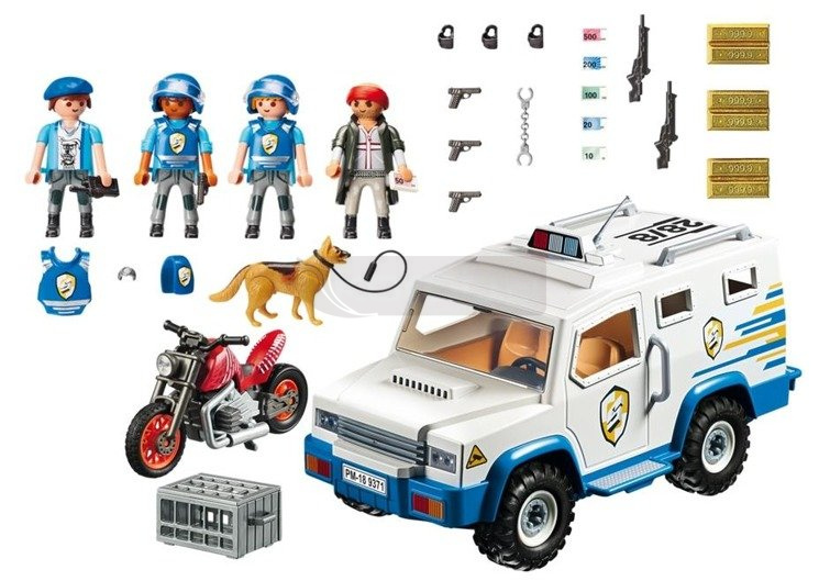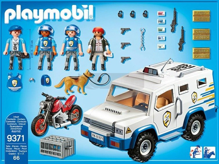 Zestaw z serii City Action Transporter Pieniędzy to wspaniały zestaw, który rozkręci zabawę. Auto ma zdejmowany dach. W zestawie znajduje się wiele elementów w tym: 4 figurki ludzików, figurka psa, motor, auto, pistolety, karabiny, transporter na pieniądze, sztaby złota i wiele innych akcesoriów. Zestawy i ich poszczególne elementy można ze sobą dowolnie łączyć, a tym samym tworzyć nowe i niepowtarzalne kombinacje. Zestaw przeznaczony jest zgodnie z zaleceniami producenta dla dzieci od 4 lat.