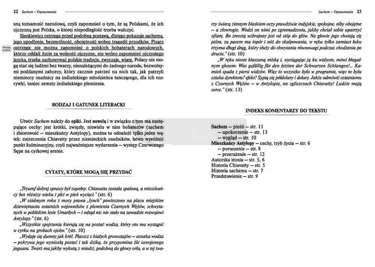 Wydanie Sachema kompletne bez skrótów i cięć w treści. W tym wydaniu znajdziesz odpowiedzi na pytania z podręcznika - pewniak na teście, czyli wskazanie zagadnień, które zwykle pojawiają się w pytaniach z danej lektury we wszelkich testach sprawdzających wiedzę, a także w podręcznikach i na klasówkach. Zawiera bardzo szczegółowe streszczenie oraz drugie skrócone, ułatwiające szybkie przygotowanie się przed lekcją. Opracowanie zawiera plan wydarzeń, wnikliwie wyjaśnioną problematykę oraz szerokie charakterystyki bohaterów.